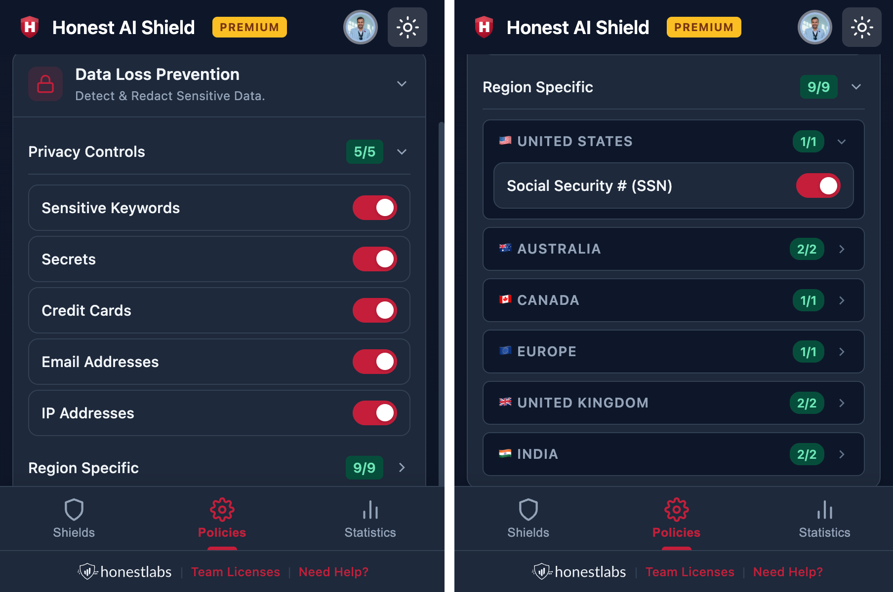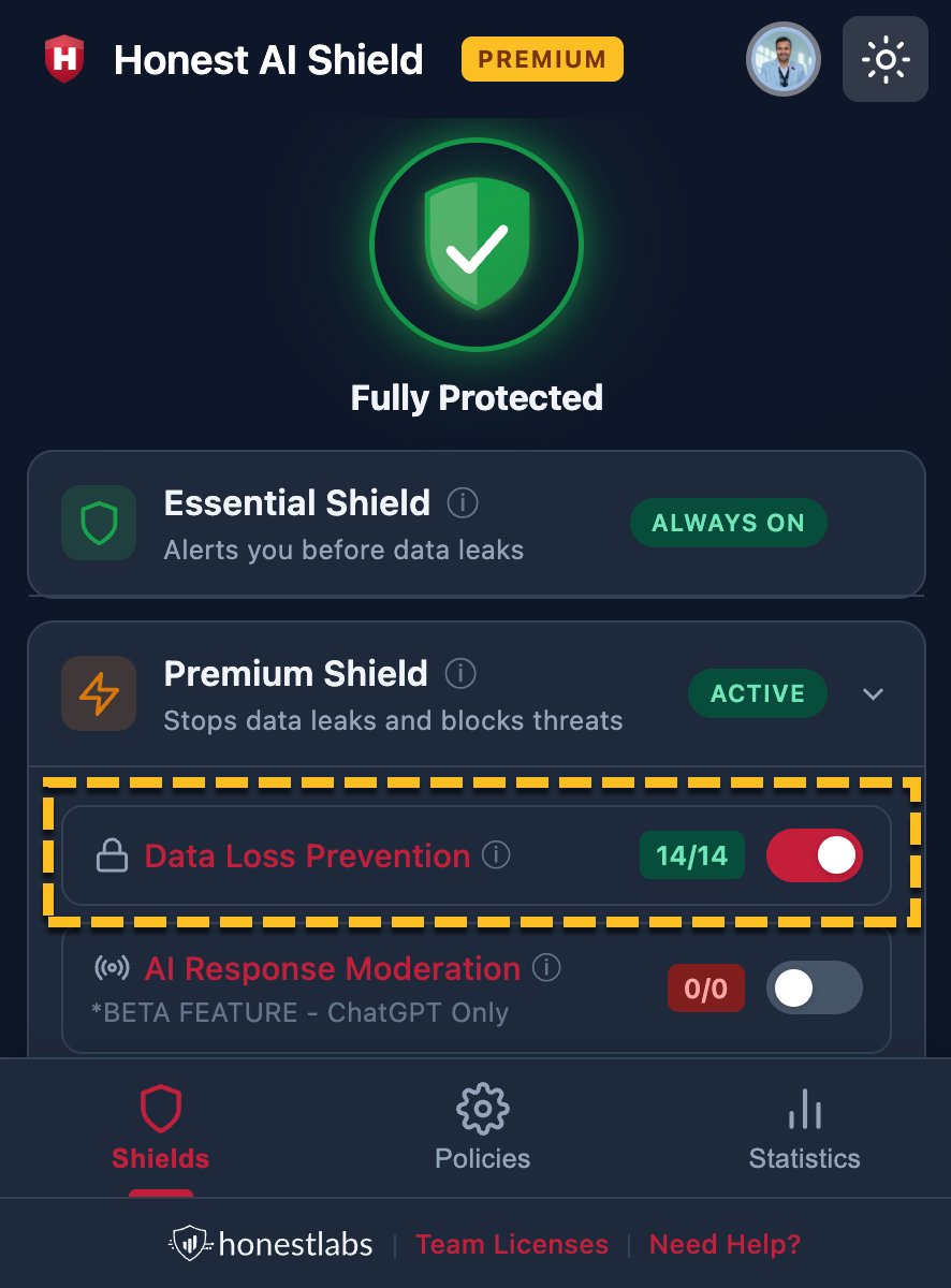 The DLP toggle must be turned ON in the Shields tab for any of these policy toggles to take effect. The Policies tab controls what gets detected; the Shields tab controls whether detection runs at all.